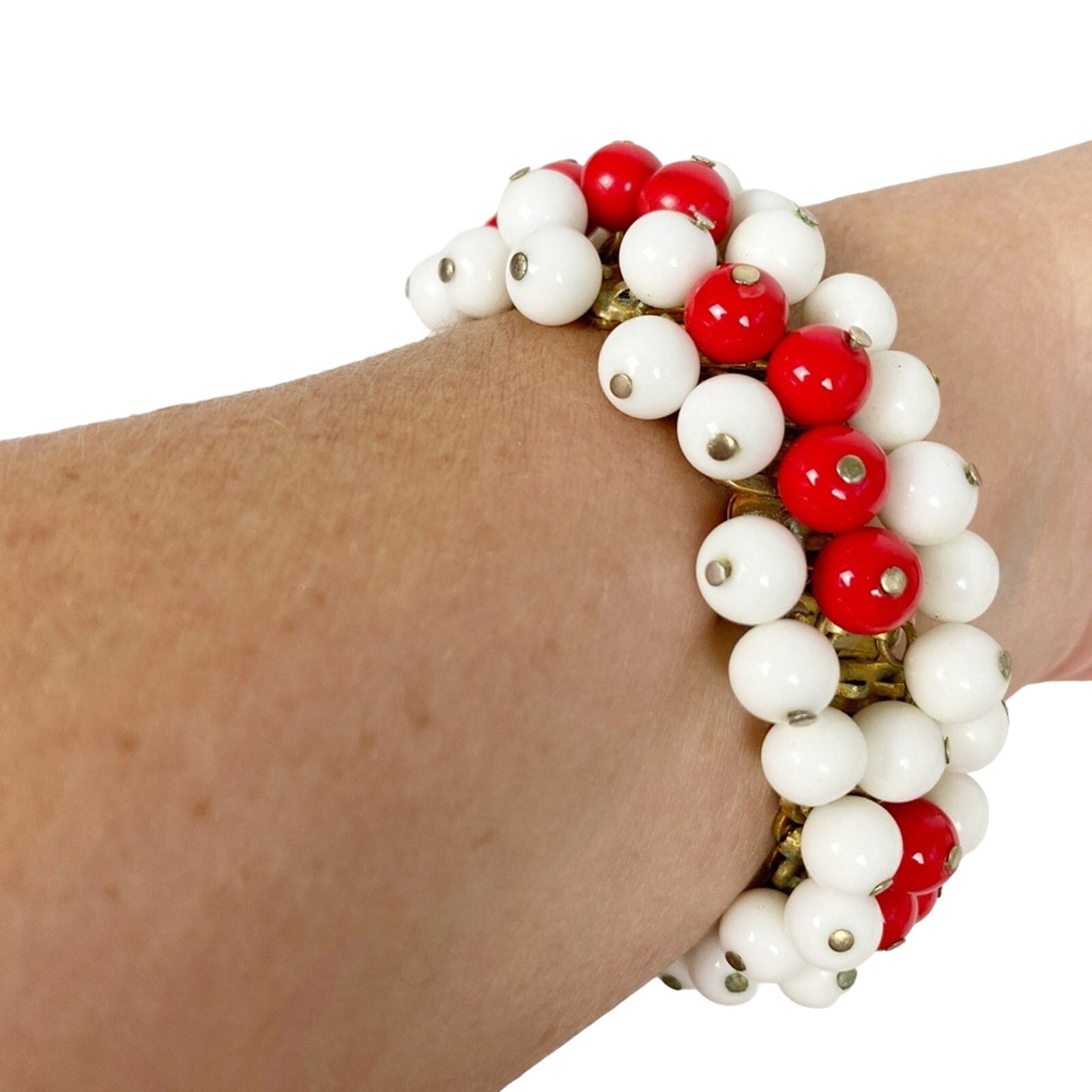 beaded red & white stretch BRACELET vintage costume jewelry Made in Japan