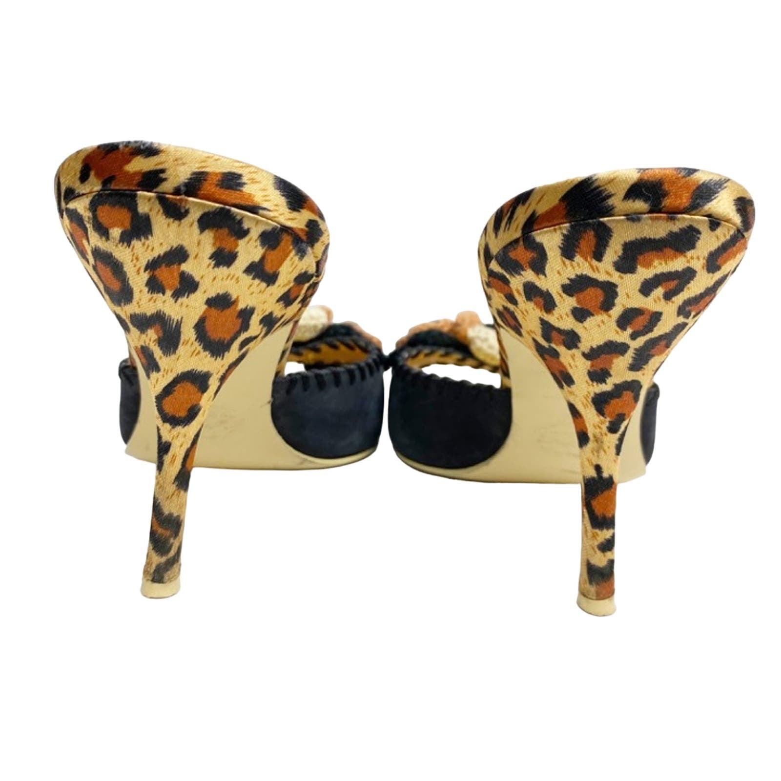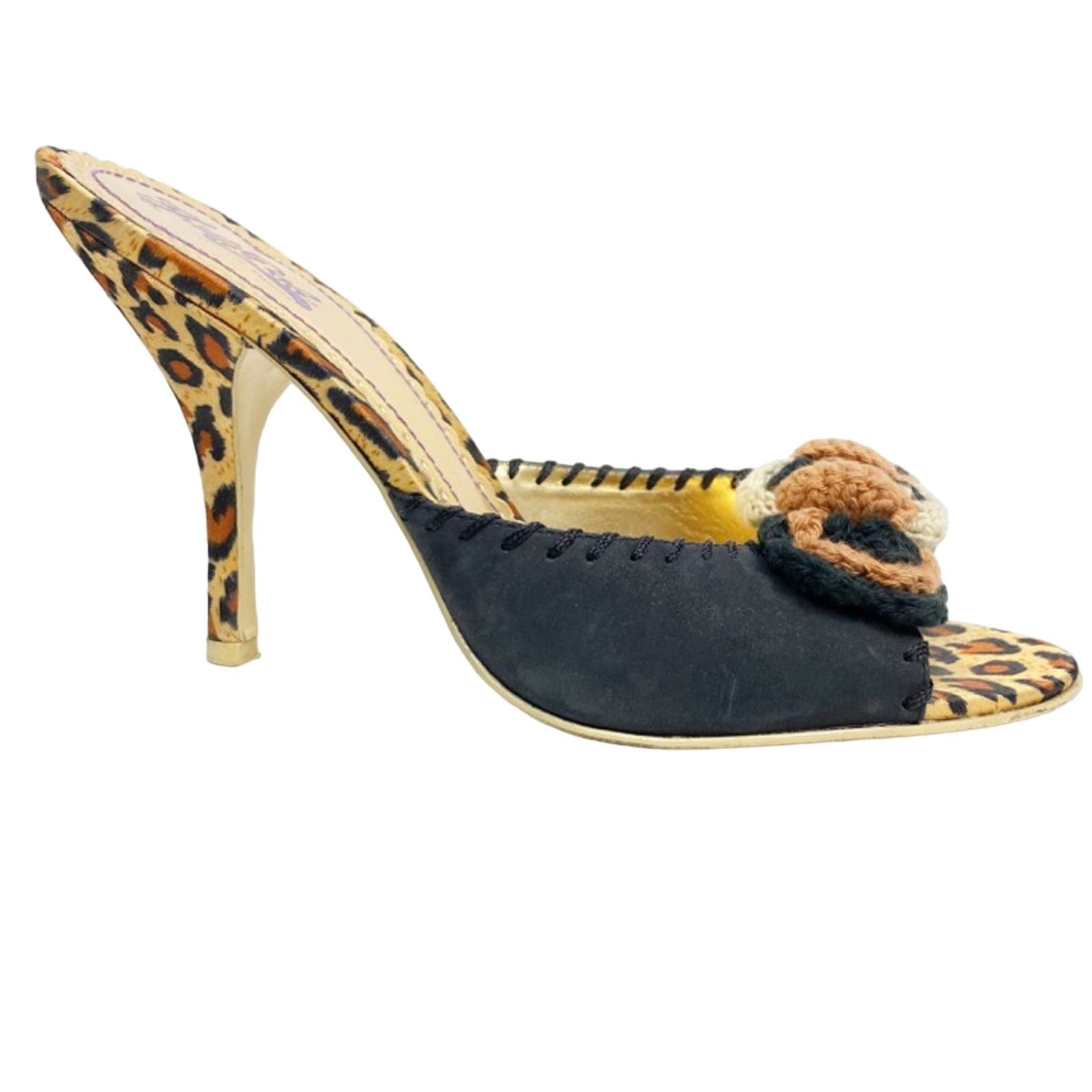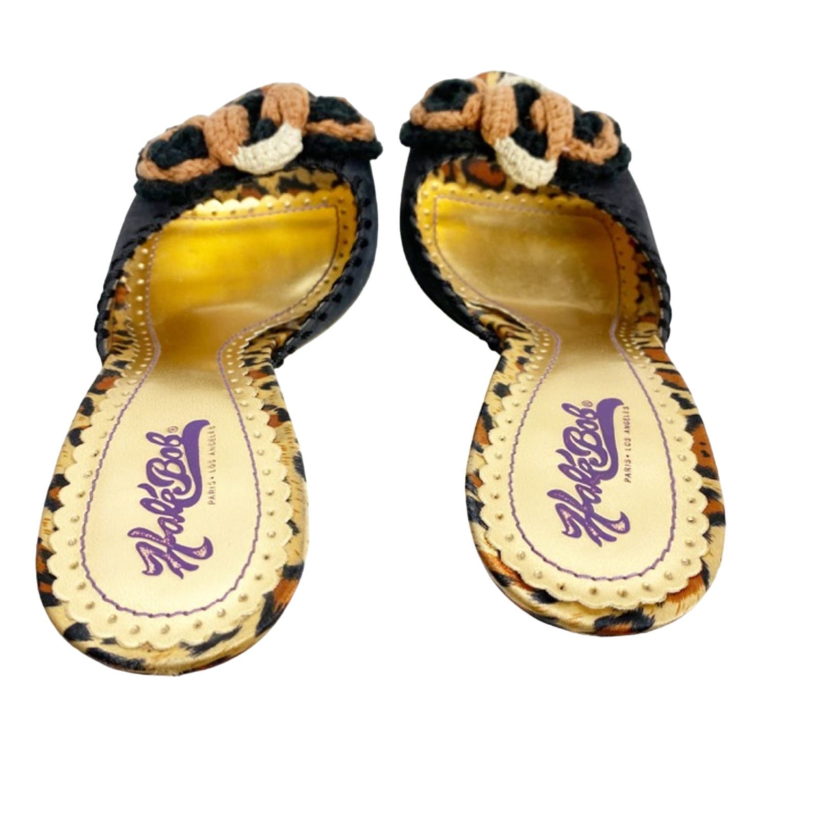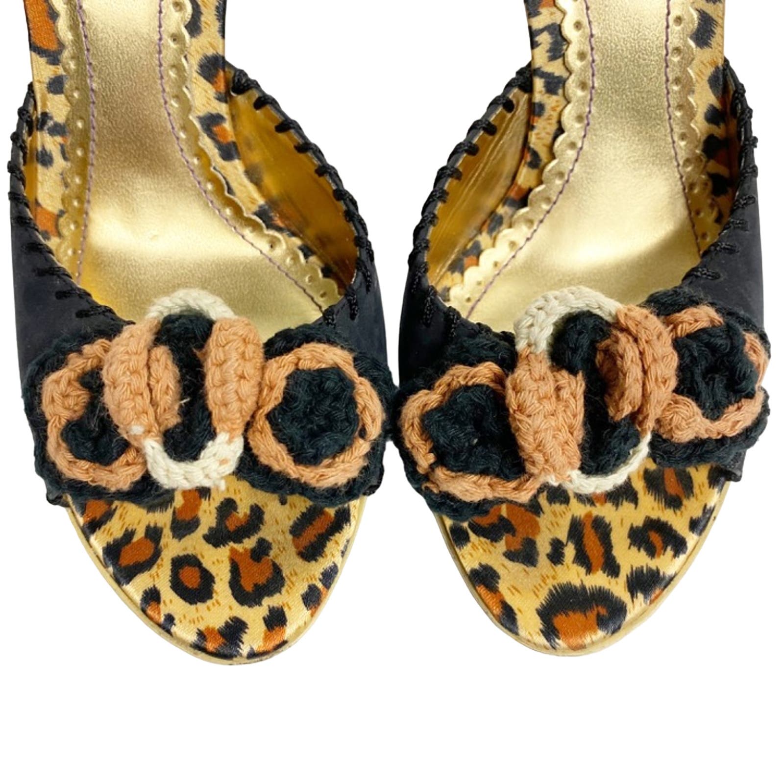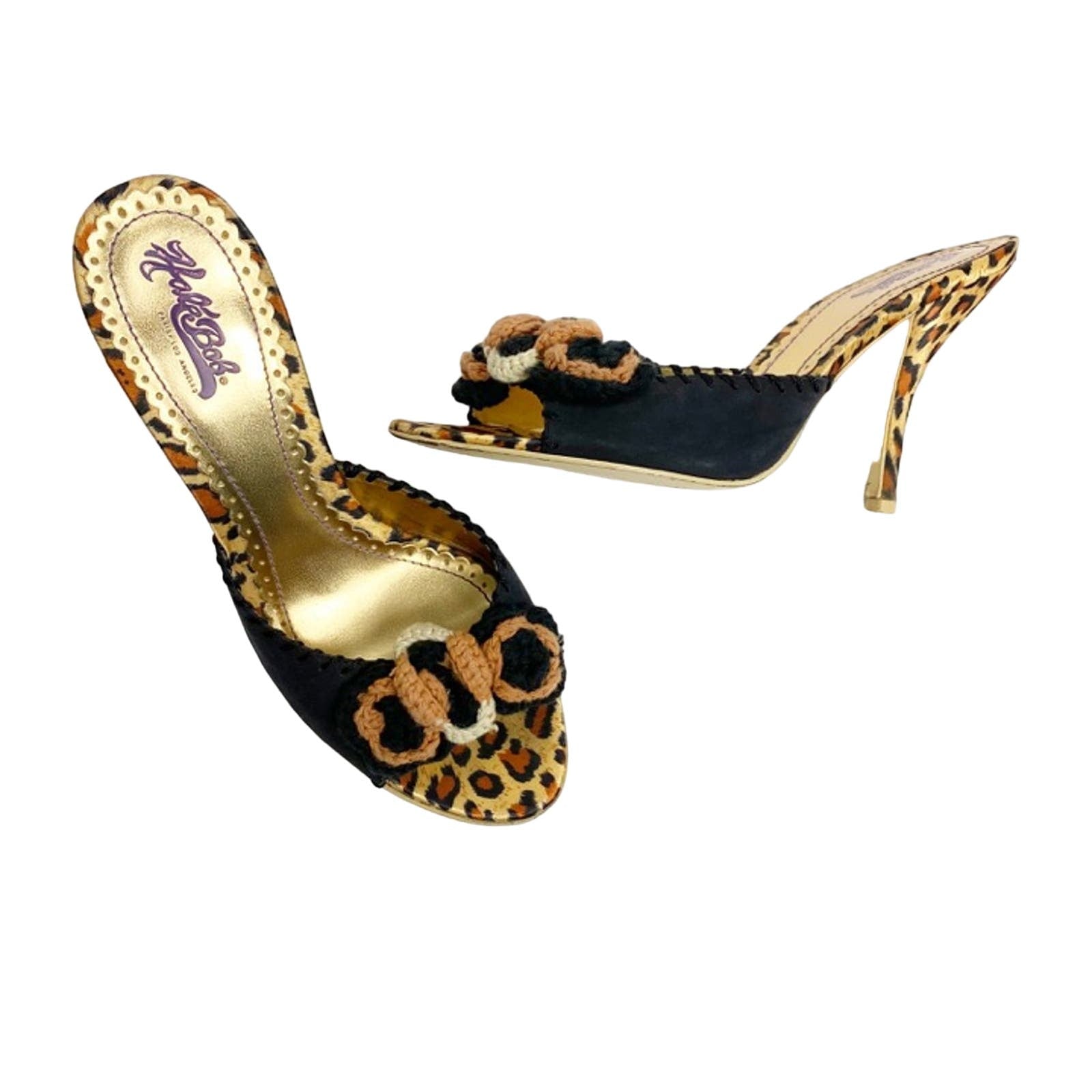 Hale Bob floral & leopard HEELS black brown crochet knit flowers size 7 M shoes