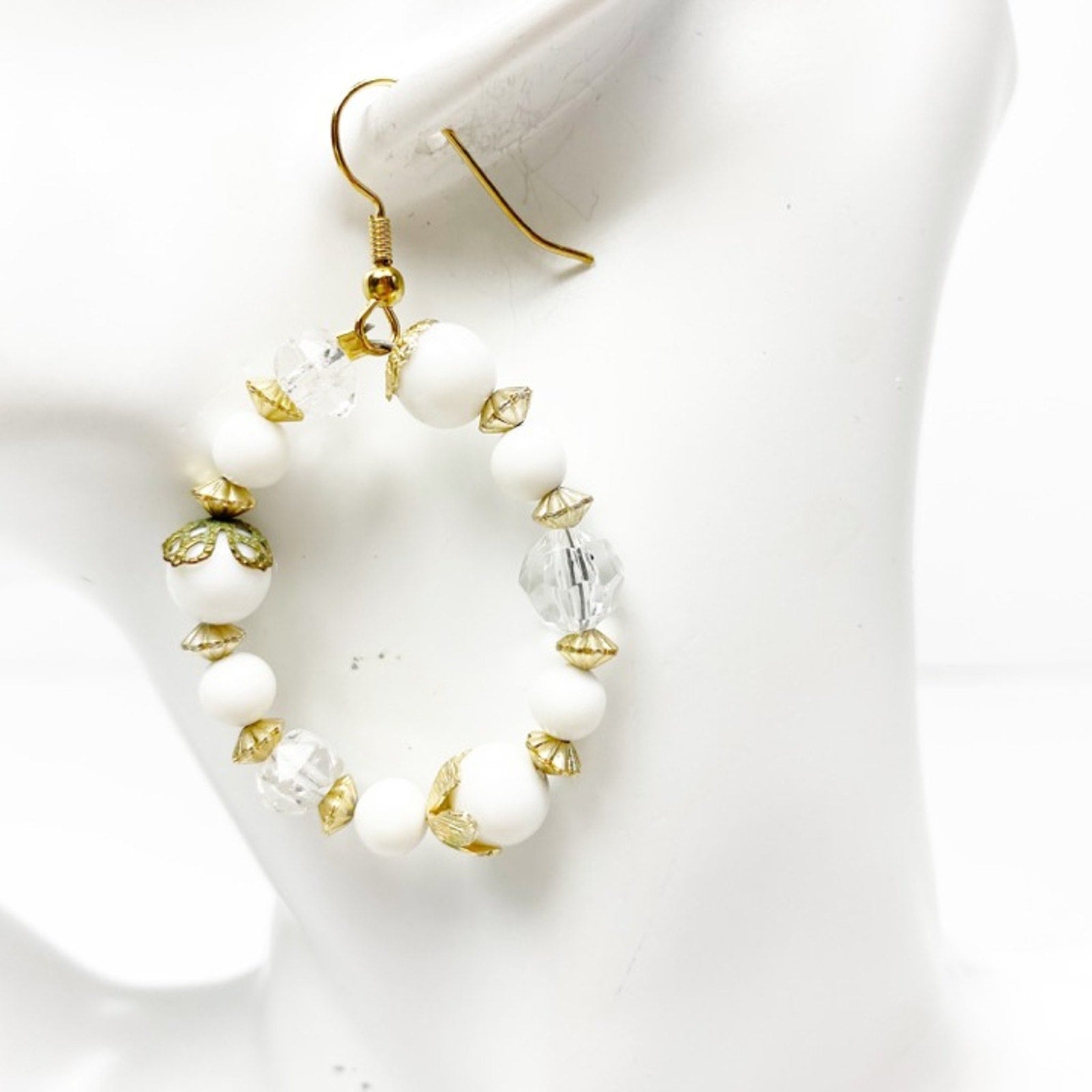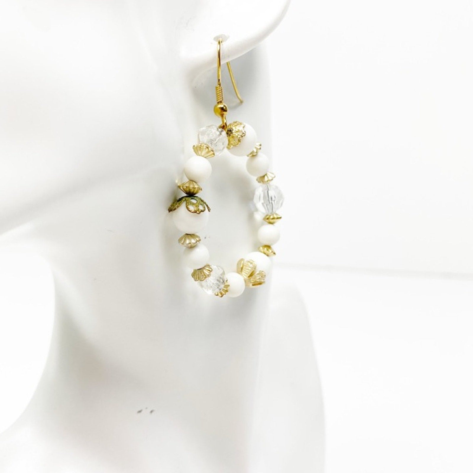 handmade crystals white & gold loop beaded EARRINGS jewelry NEW vintage beads
