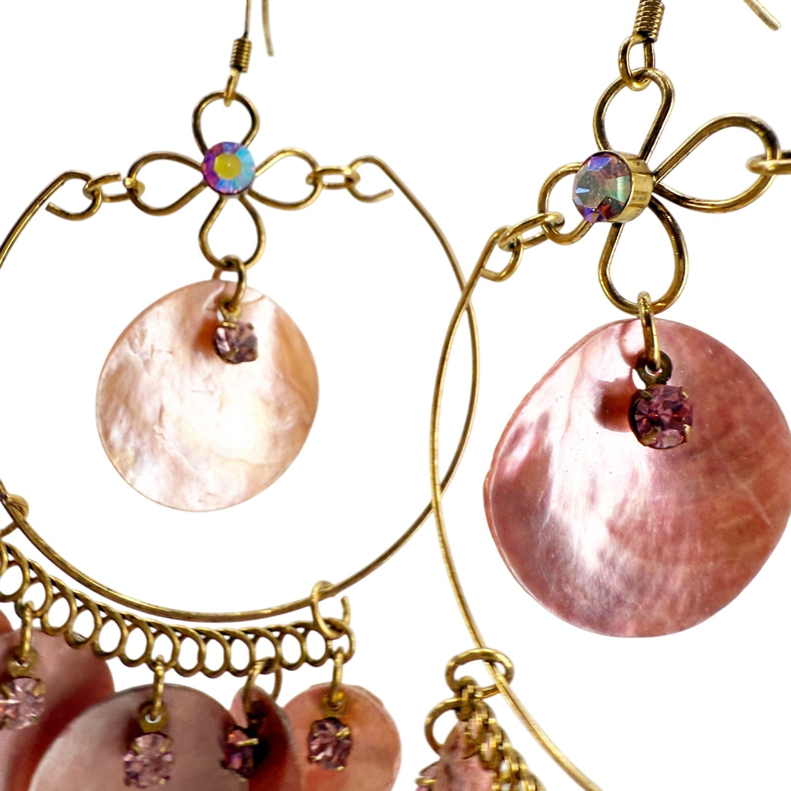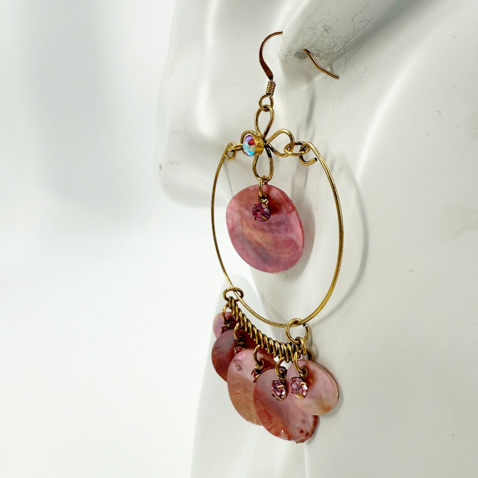 vintage BOHO gold pink shimmer shells rhinestones hook dangle EARRINGS jewelry