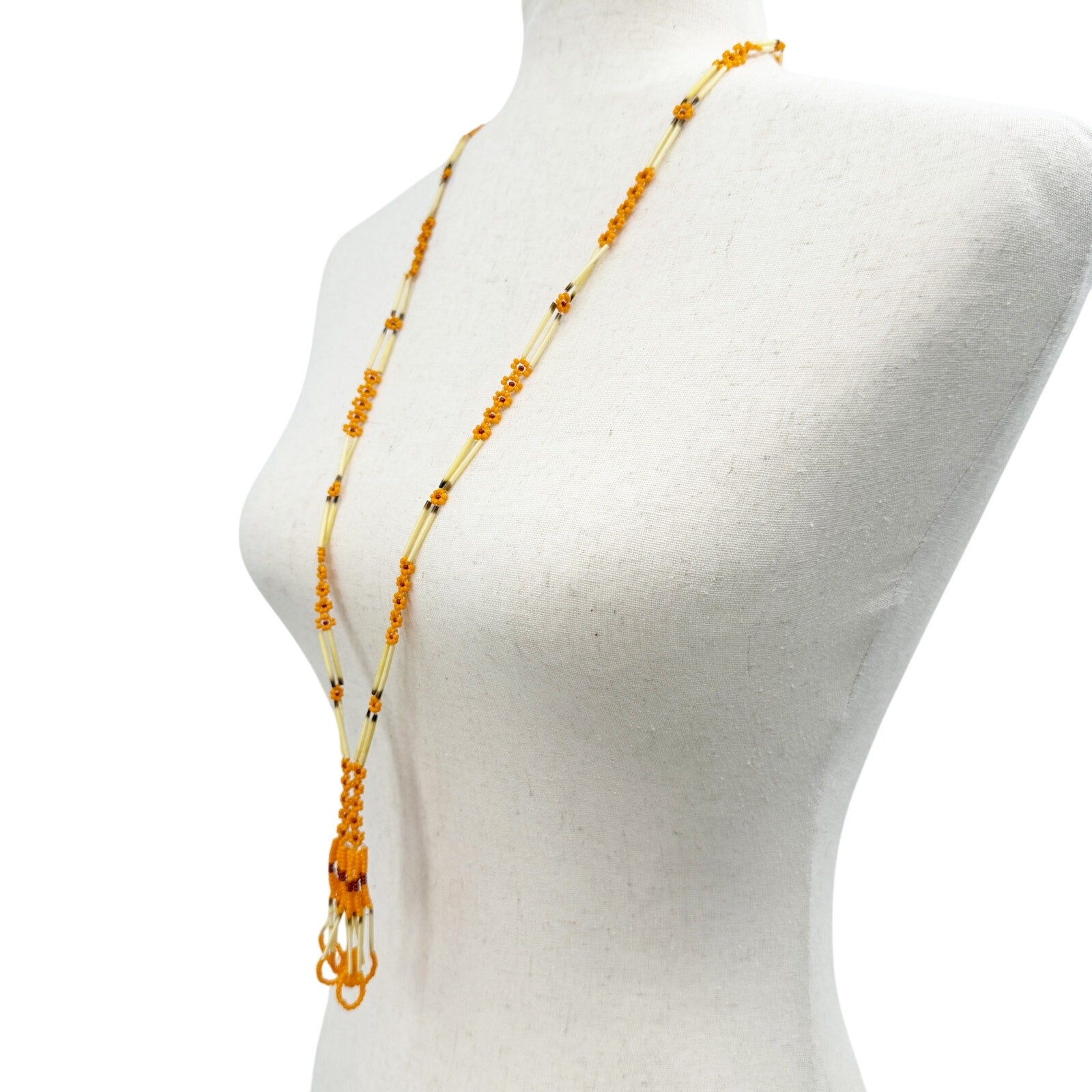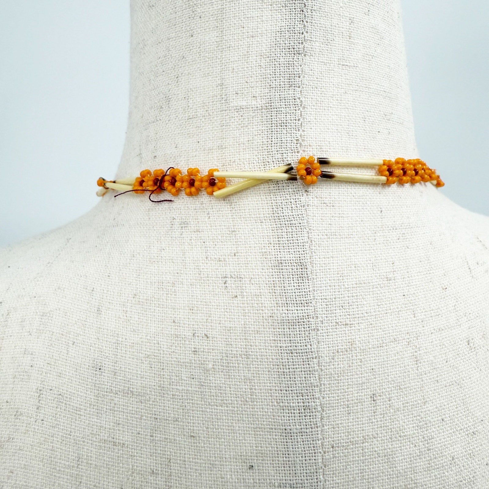vintage orange & burgundy seed bead flowers Tassel Necklace porcupine quills