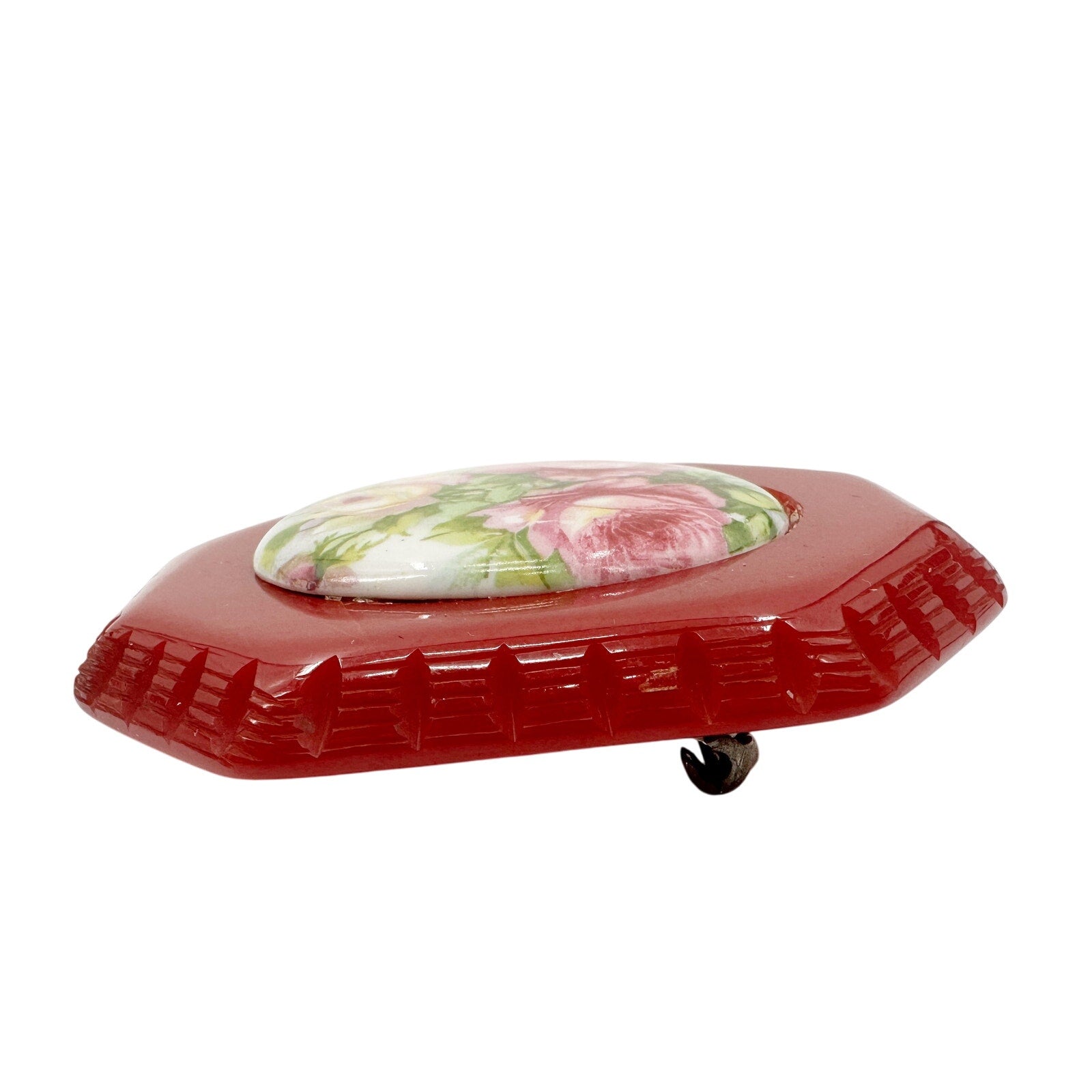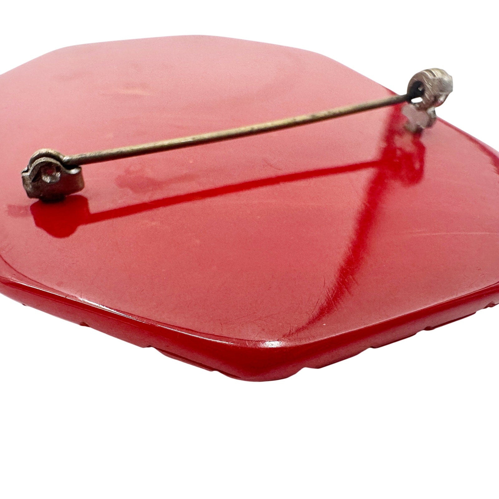 vintage red celluloid flower ceramic center octagon BROOCH floral jewelry pin